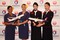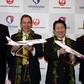 業務提携を発表するハワイアン航空のマーク・ダンカリー社長(左から2番目)と日本航空(JAL)の植木義晴社長(左から3番目)